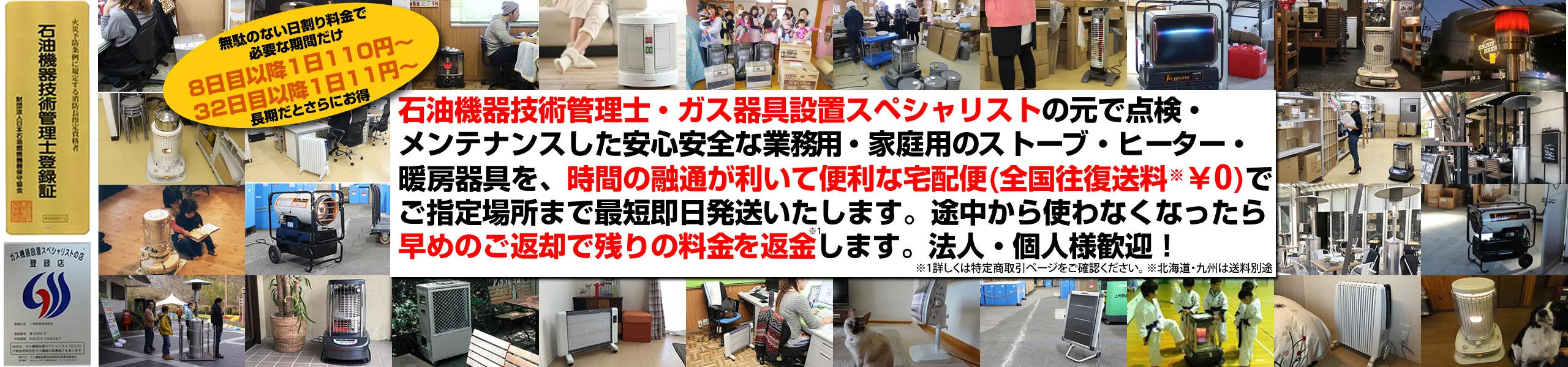 一般の販売・レンタル・修理業者は十分なサービスが行えず、ときには、不良修理による一酸化炭素中毒死事故や火災事故等も発生するようになりました。 ストーブヒーター暖房機器レンタル専門店では、よりお客様に安心してお使い頂く為に、石油機器技術管理士・ガス機器設置スペシャリストが在籍し、点検、メンテナンスの監督を行っています。